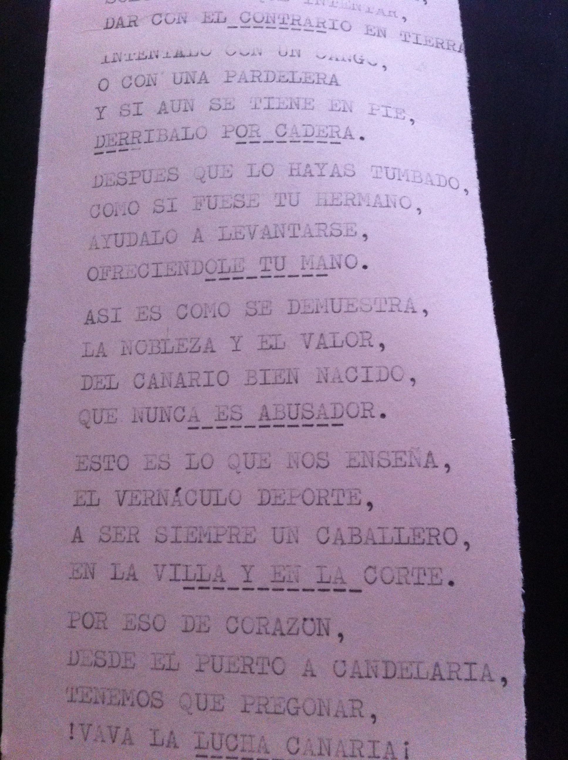 Cierro el relato, extenso, porque 80 años de vida no se resumen de cualquier manera, contando que a mi padre le gustaba escribir. Tenía una máquina que luego usé yo mucho y con la que aprendí mecanografía. Era una Olympus de teclas duras que había que aporrear con fuerza para conseguir levantar los caracteres. En ella, de vez en cuando, escribía cosas. Apuntes, borradores, en esos mismos pedazos de cartón de tabaco que reciclaba lo mismo para hacer una lista de la compra como para apuntar los resultados de una quiniela. En uno de ellos, escribió un texto dedicado a la lucha canaria que apareció el otro día rebuscando en mis cajas y que aquí les dejo e ilustro con la foto del texto original.