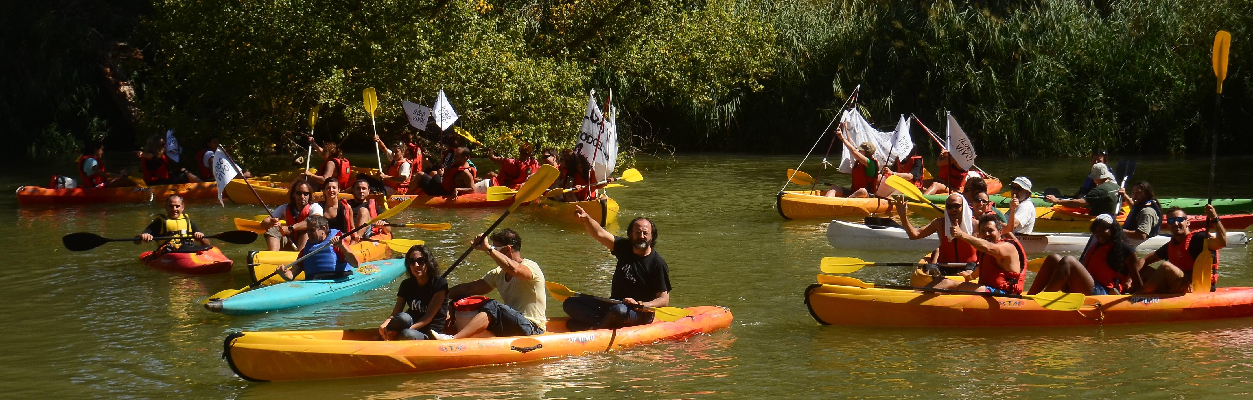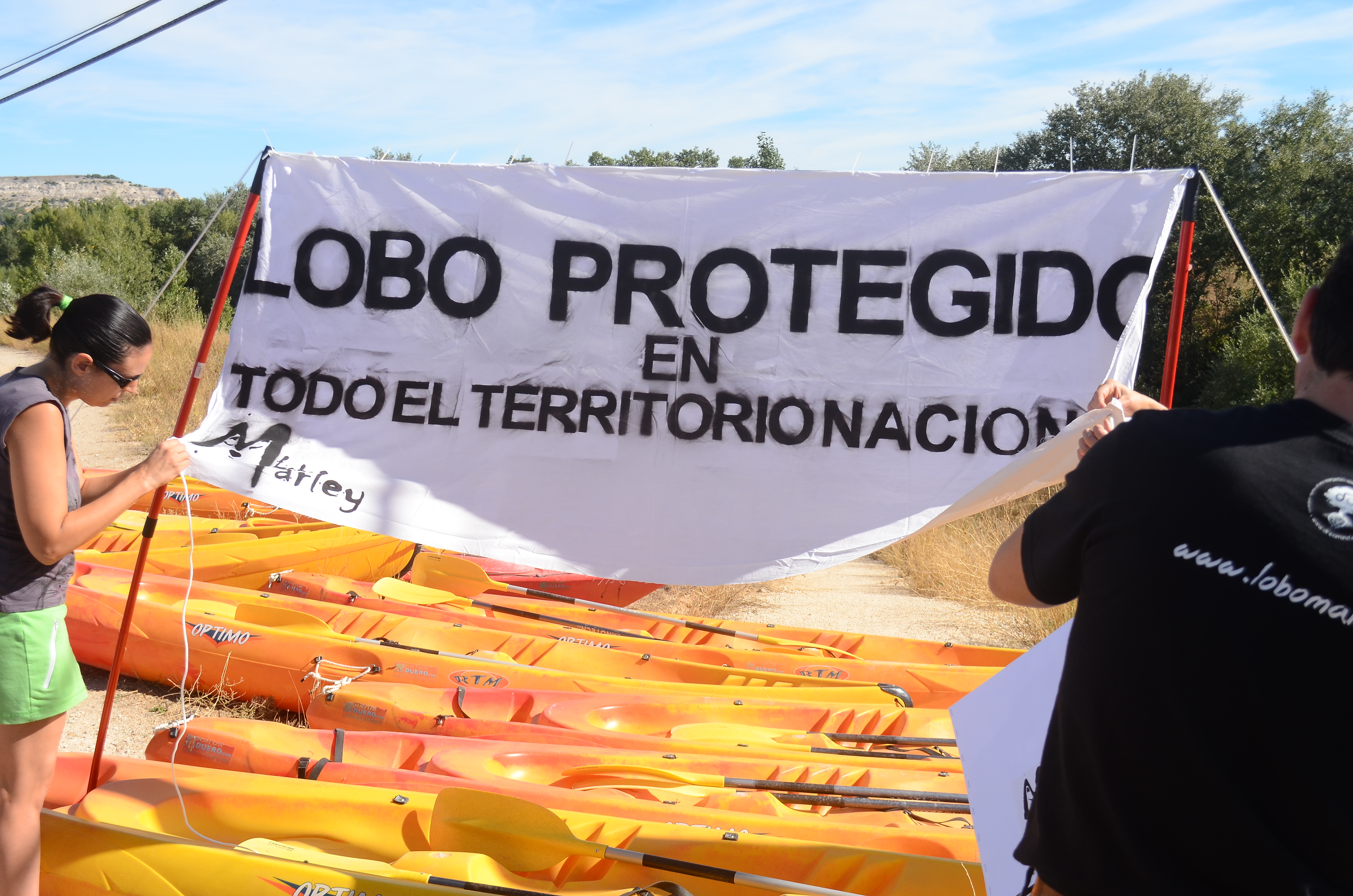 Miembros de la asociación Lobo Marley realizaron el sábado una marcha en piragua por el Duero, actual frontera de muerte para el lobo ibérico, para reivindicar su protección total en la Península Ibérica. Camisetas de la asociación, pancartas y aullidos fueron las señas de identidad de esta colorida protesta que transcurrió entre Peñafiel y Pesquera, en la provincia de Valladolid. El presidente de Lobo Marley es el naturalista Luis Miguel Domínguez. /Fotografías: Lolo Mata.
