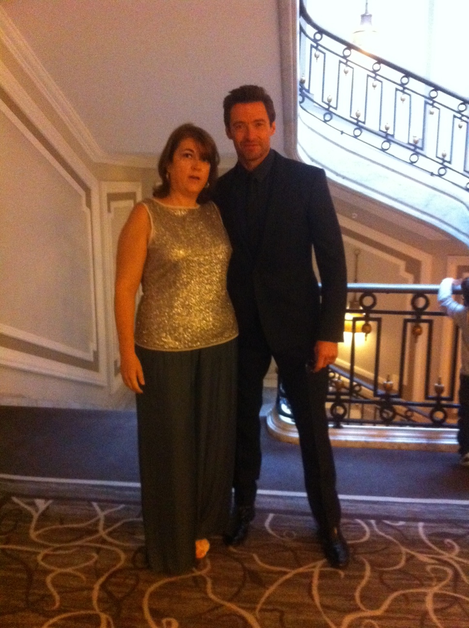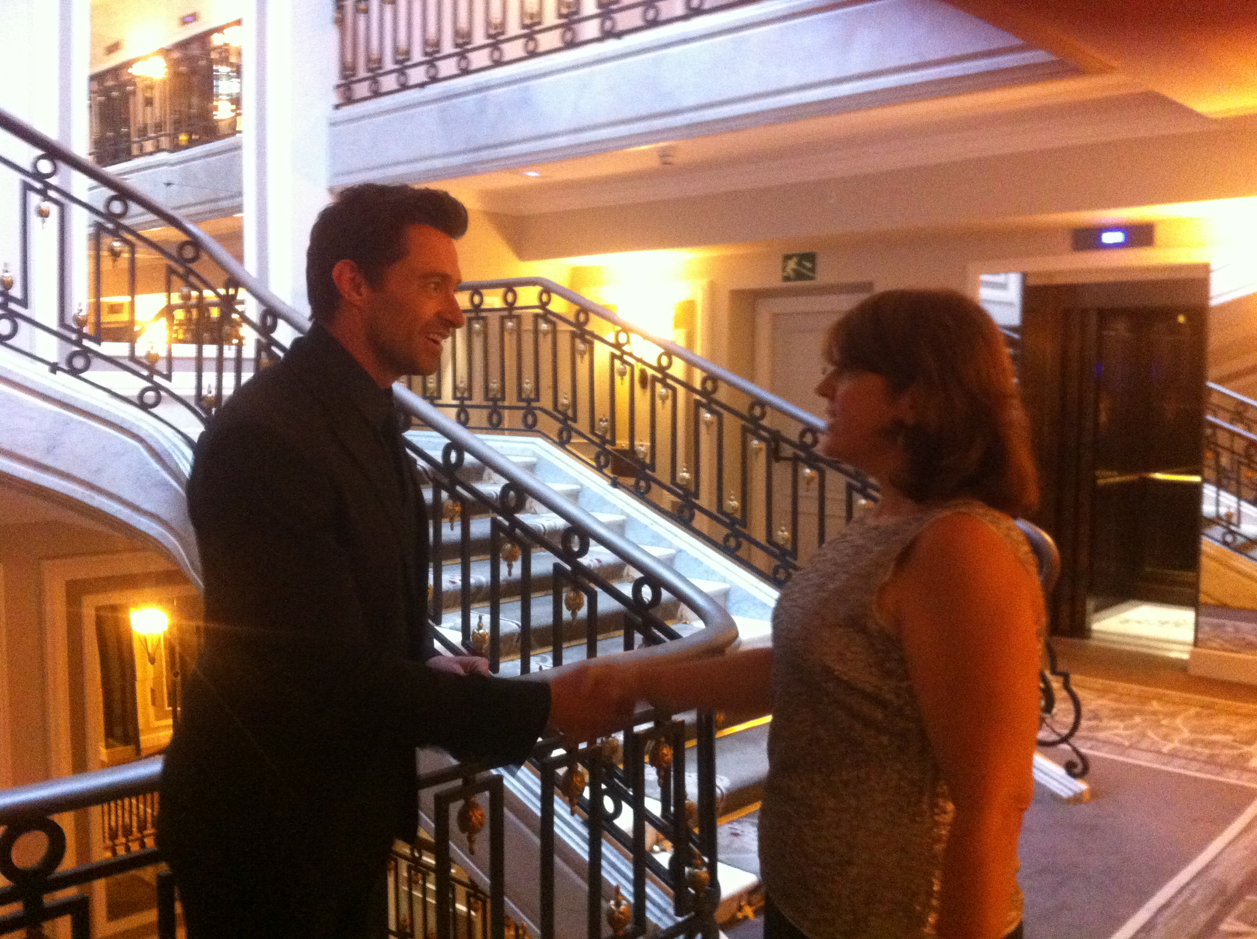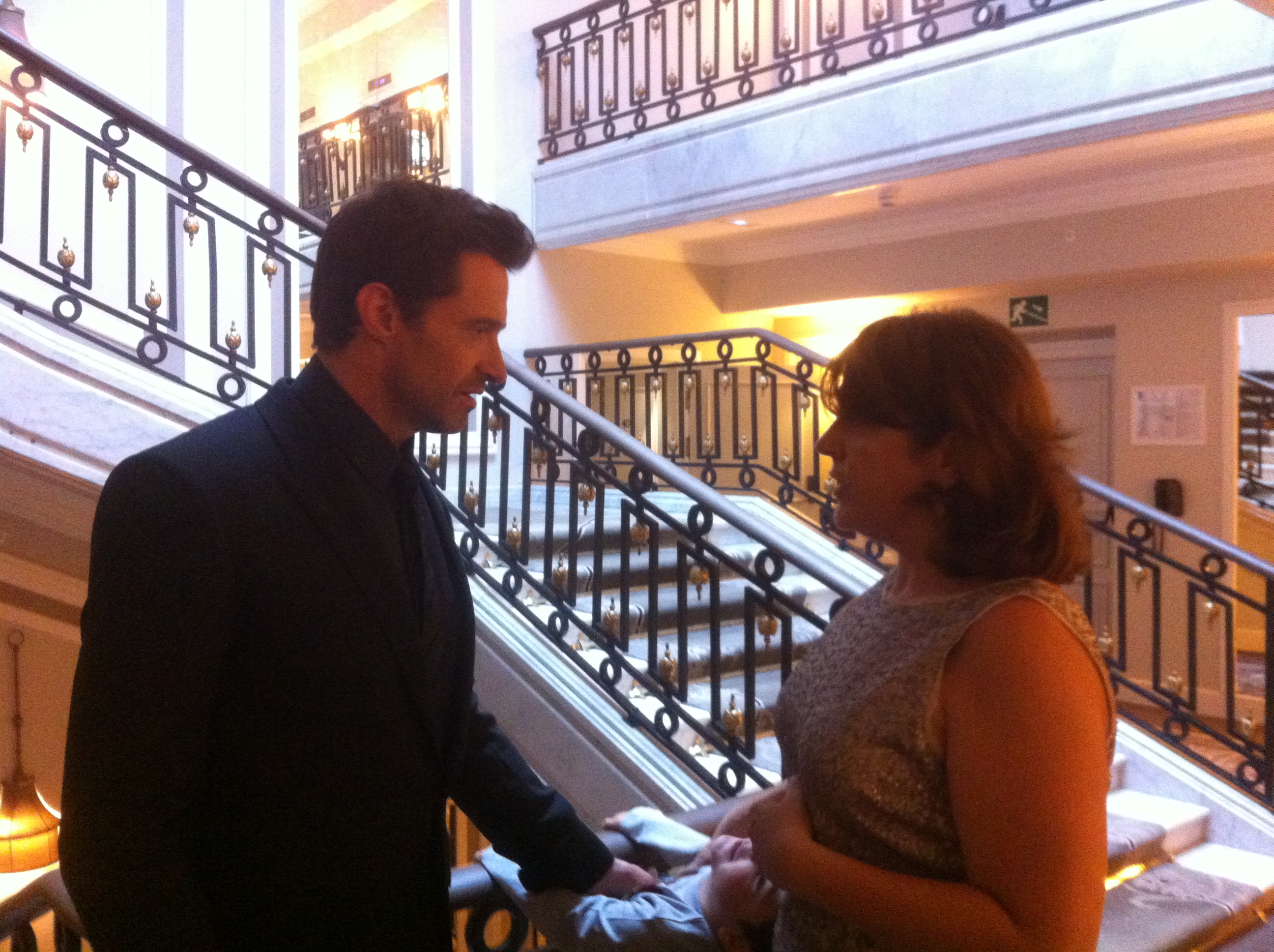 17.41 horas. Allí estoy yo, con cara de boba sudorosa y una sonrisa enorme acercándome a Hugh Jackman que me tiende la mano y me sonríe. Le acerco la mejilla. Aunque dudo (por el sudor). Leve roce. Él me pregunta: «Sorry, I didn’t understand your name». María Jesús, le digo. «Ahhh, Maria», dice él arrastrando la r, sonriéndome y con una sonrisa que ya me parte por la mitad, con esa voz que acaricia. Estuve a punto de decirle…como la de West Side Story! Igual tenía suerte y se dejaba caer con un «Maria I’ve just met a girl named Maria»… pero en ese momento se escuchó a David gritando, desde el último tramo de escaleras «LOBEZNOOOOOOOOOOOOO, LOBEZNOOOOOOOOOOOOOOOOOO».