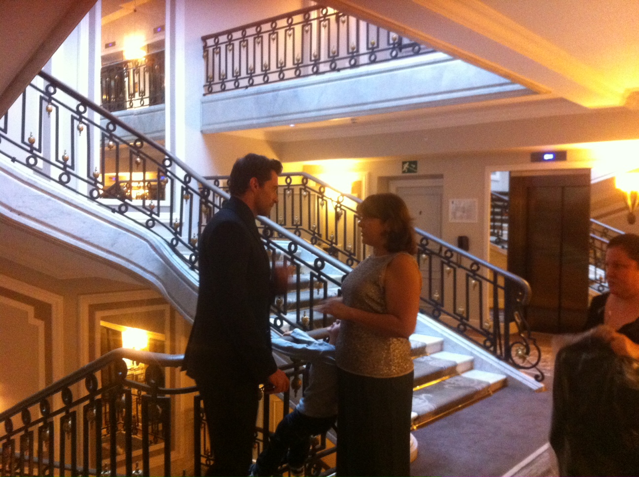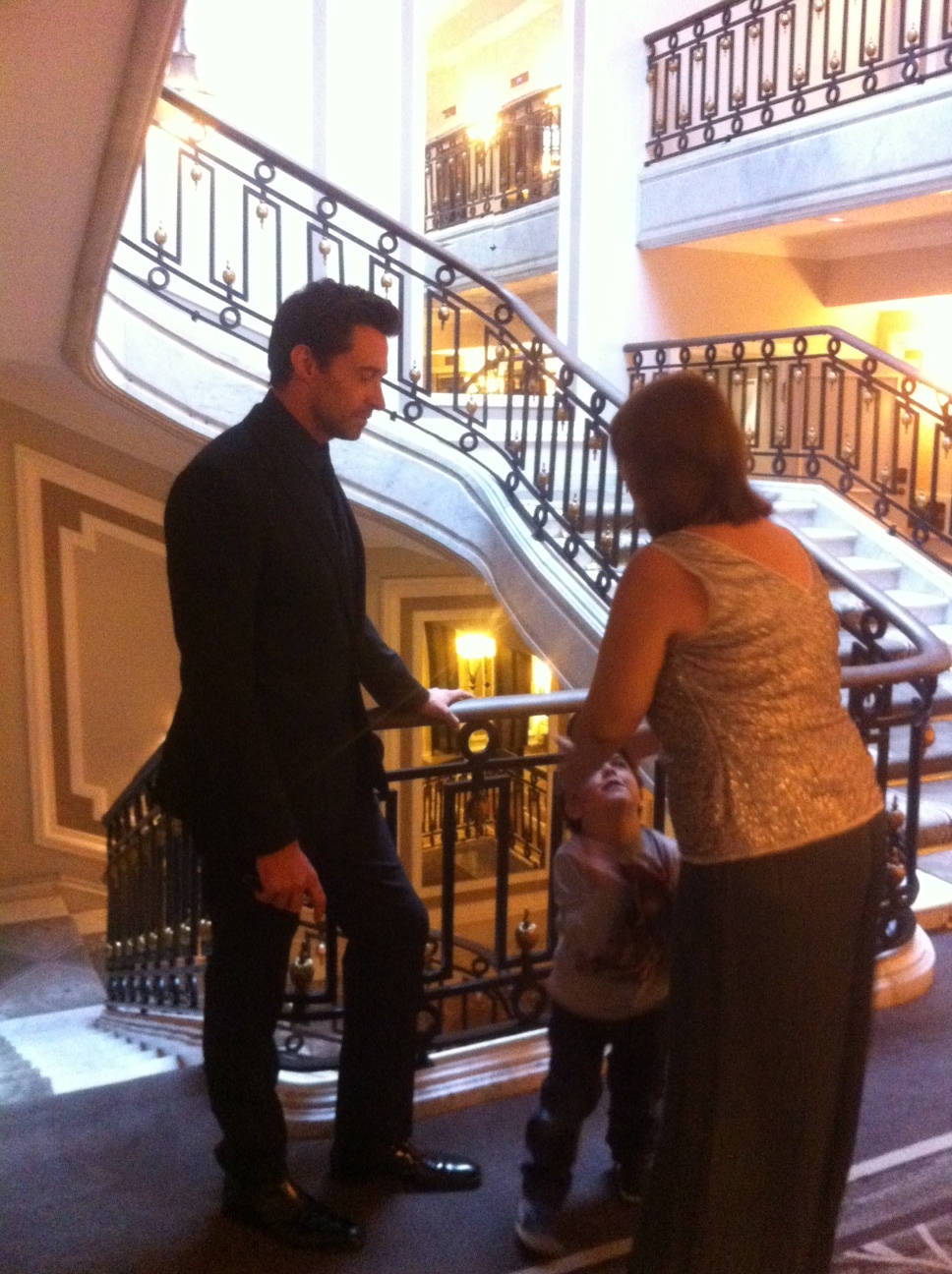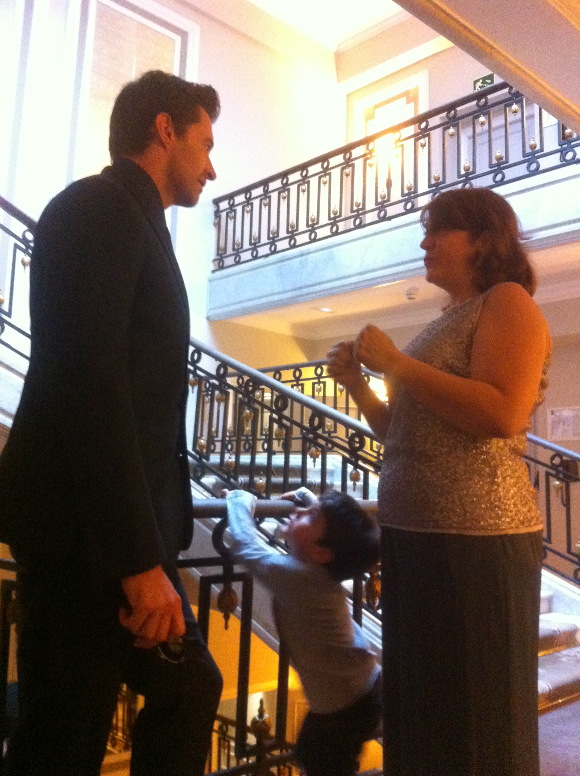 Seguimos intentando que David se pare un minuto para que Jackman lo coja y podamos hacer una foto los tres. No quiere. Se tira al suelo delante de él e intenta patearlo. Miro a Miguel, de Warner, porque lo veo con el rabillo del ojo y le pregunto «¿Estarás haciendo fotos de esto?» No, me dice. Estaba esperando a que os pusiérais a posar. Maldita sea, pienso…»Pues saca fotos! Esto seguro que es inédito!!!» Jackman se agacha a intentando que no lo patee y para recogerlo del suelo. Lo levanta con ayuda de su publicista y David vuelve a salir corriendo.