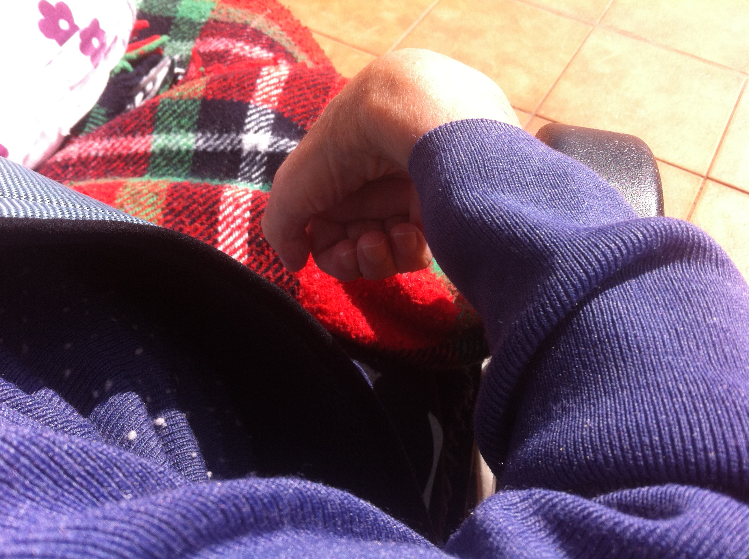 La mano de mi madre, hoy, durante su paseo diario. ‘La abuela necesita besitos’ es un cuento de Ana Bergua, ilustrado por Carme Sala y editado por Proteus.